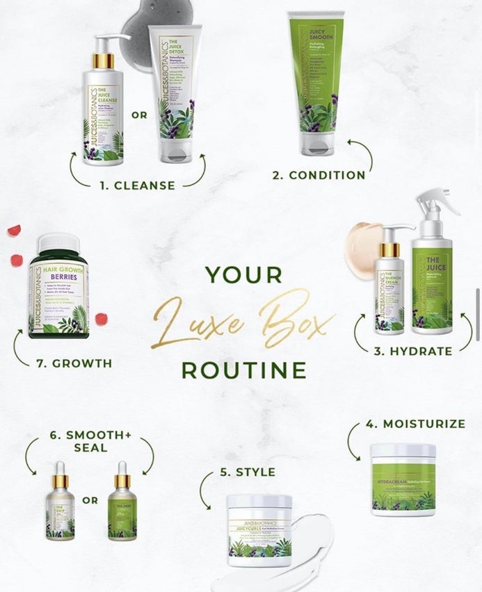 This all-in-one 9-piece hydration and growth retention system is thoughtfully curated to bring your hair ease, flow, and lasting manageability. From a deep, purifying shampoo to rich hydration that locks in moisture and defines your strands, every product in the JuiceBox Luxe works in harmony to help you retain length, nurture your scalp, and experience the healthiest hair of your life.